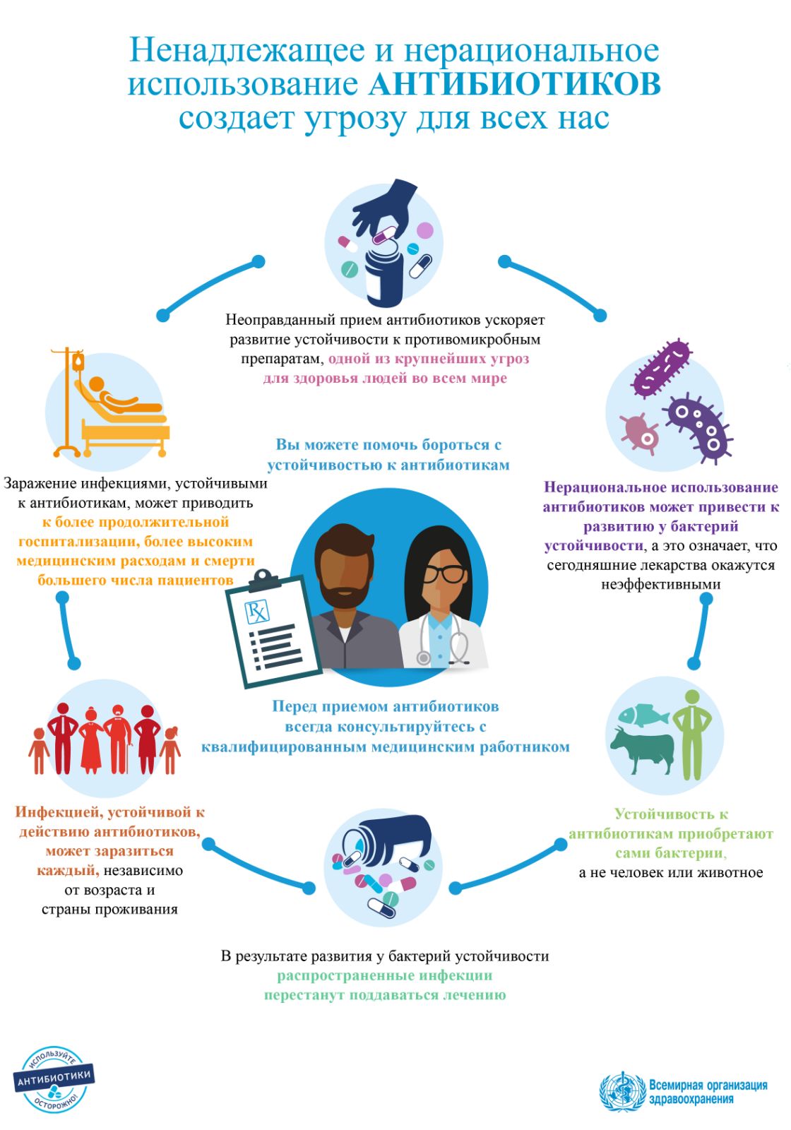 Впервые проблема правильного использования противомикробных препаратов была поднята Всемирной организацией здравоохранения (ВОЗ) в 2015 году. С тех пор ежегодно проводятся масштабные мероприятия с целью повышения осведомленности людей во всем мире о проблеме устойчивости инфекций к противомикробным препаратам, а также о применении передовых подходов, позволяющих не допустить ее дальнейшего развития и распространения.