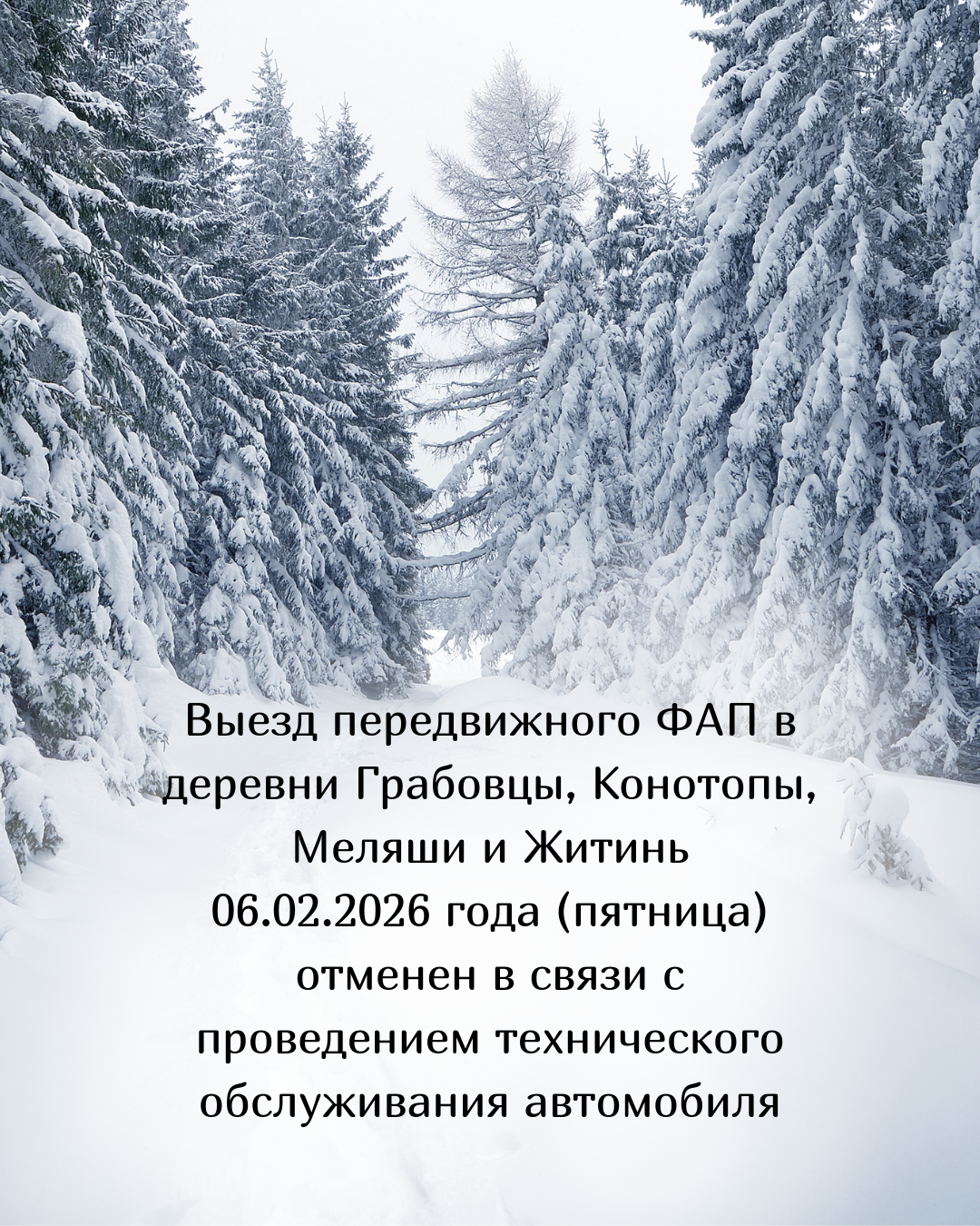 Выезд передвижного ФАП в деревни Федьковичи, Замошаны и Дягли 21.01.2025 года (среда) отменен в связи с поломкой оборудования