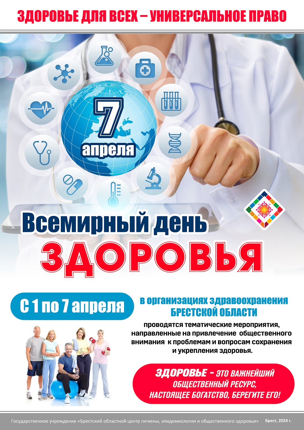 Каждый год Всемирный день здоровья проходит под своим девизом, посвященным наиболее актуальной проблеме в сфере охраны здоровья. Девиз 2024 года - «Здоровье для всех – универсальное право». Он призван напомнить о праве каждого человека на здоровье и на медицинскую помощь. Визуальным символом Всемирного дня здоровья является логотип в виде раскрытой ладони. Он символизирует защиту жизни и здоровья людей.